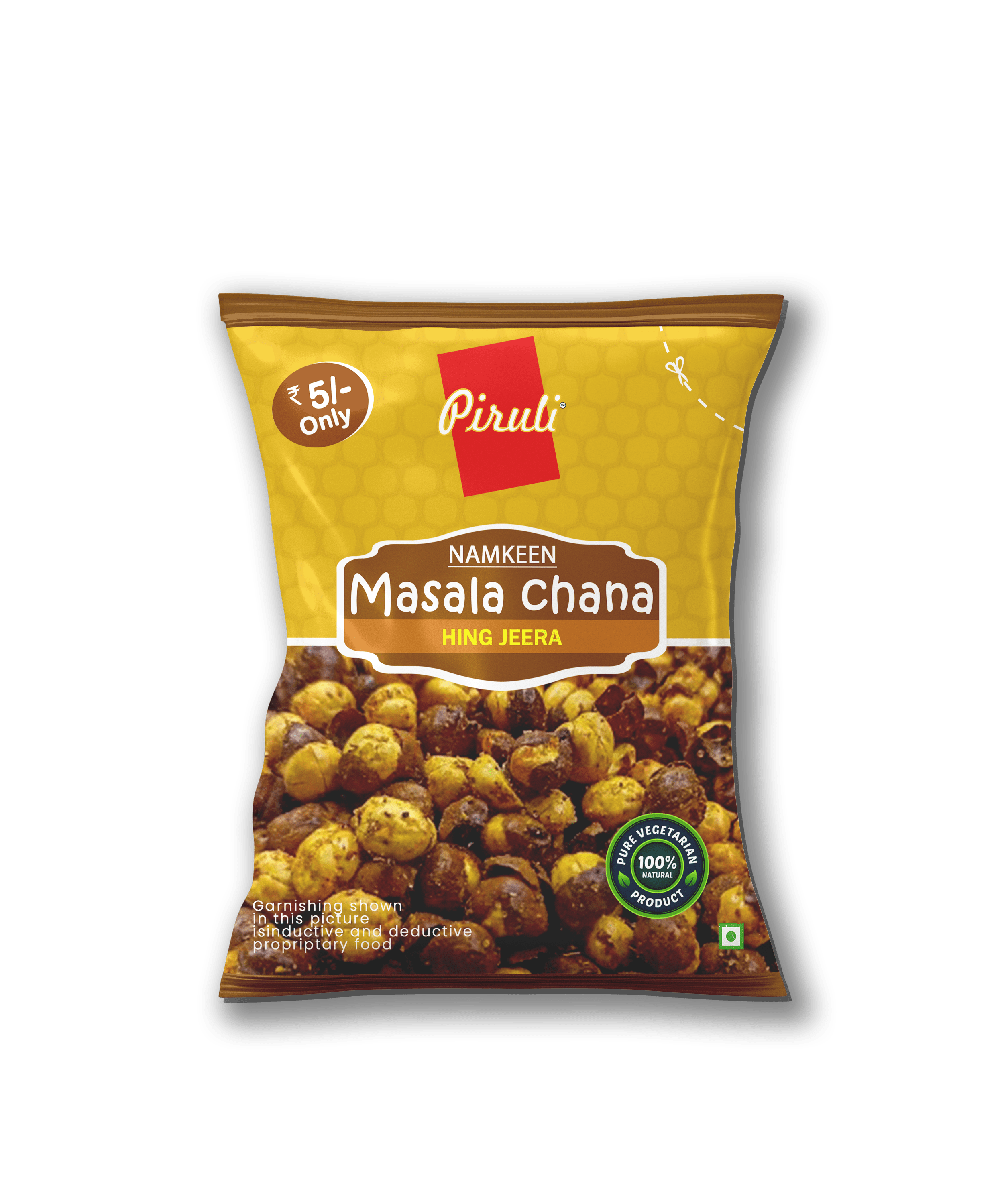 Piruli Masala Chana is a crispy and protein-rich snack made from roasted chickpeas, seasoned with a bold blend of hing and spices for a flavorful crunch, available in convenient pack sizes.